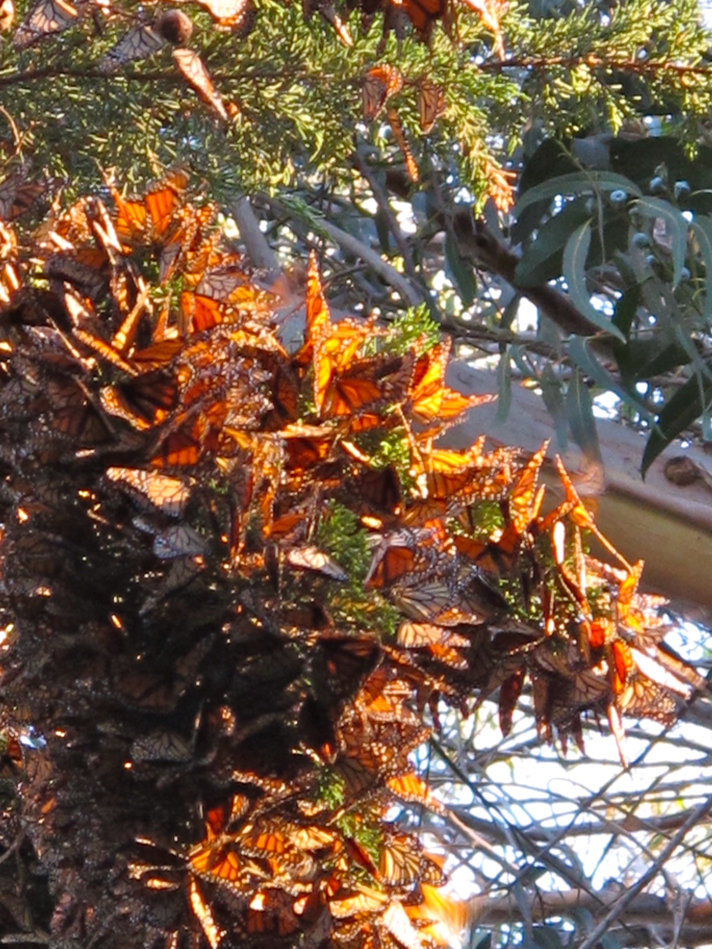 We can’t pretend to be suave about it. Steve and I have been tourists here like all the vacationers who crowd our San Juan Islands in summer. Now it’s our turn to gawk and marvel. We stared so long at 28,000 Monarchs fluttering and clustering for the night in the long rays of the setting sun that my neck took awhile to work out the resulting spasm. A small patch of 800-year-old live oaks, huge and twisted and gorgeous, gave us a hint of how California used to look.